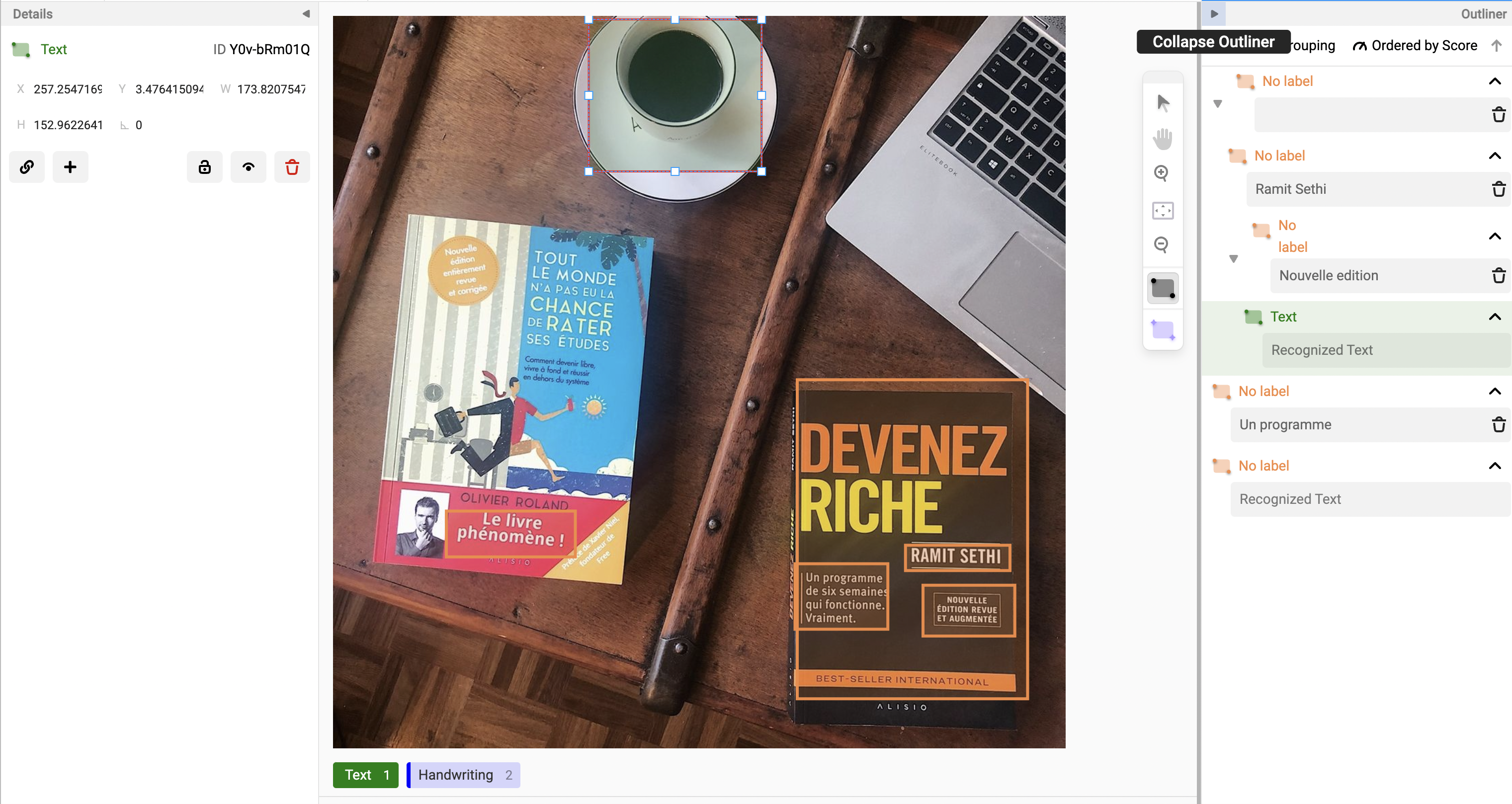 To add a region in the OCR transcription templates, draw a rectangle, and you can see a text box that appears in the Outliner panel to enter OCR text. The new functionality allows you to select a region and the Details panel changes. You can experience the following:
